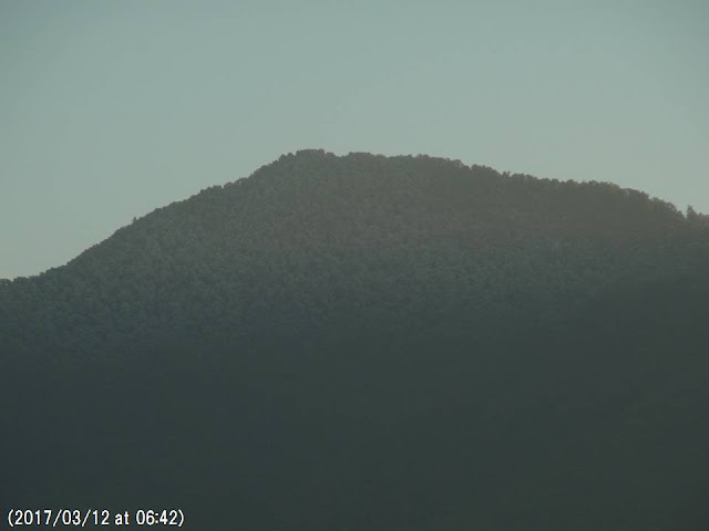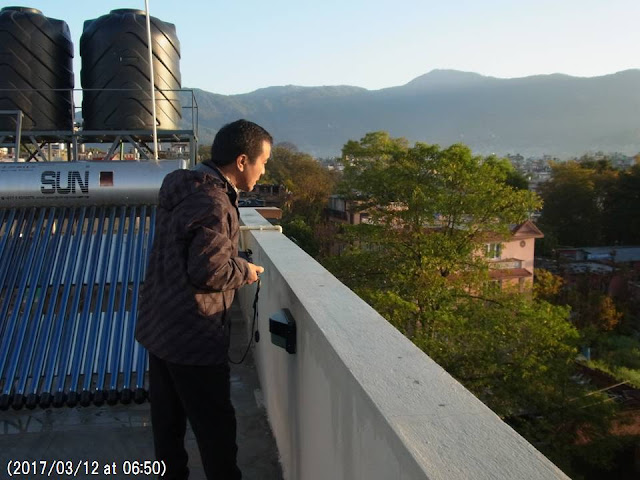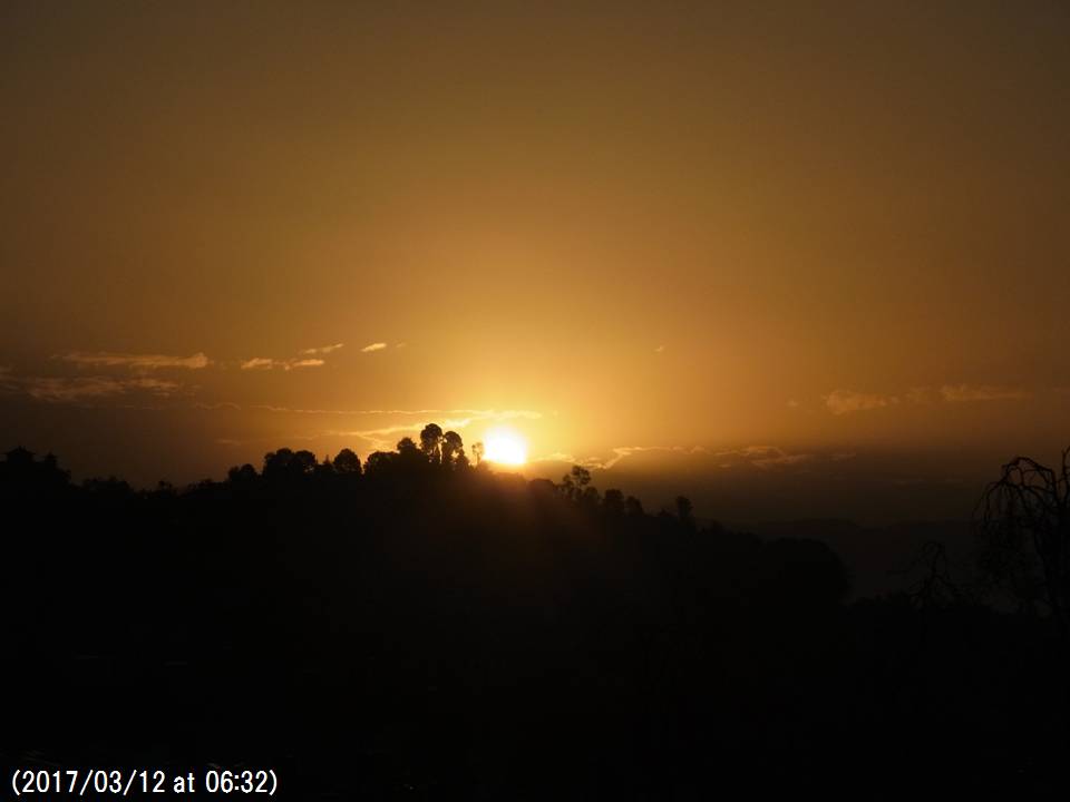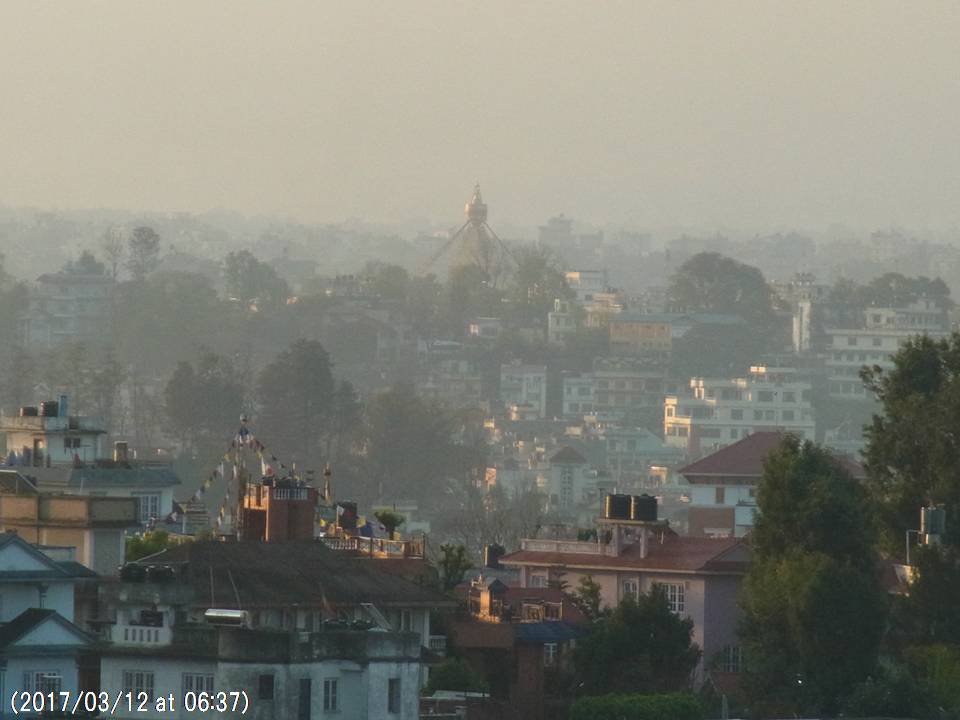 3月12日朝、久しぶりの朝日が昇る(写真19)と、雷雨で洗われ、澄んだ大気に見えていたカトマンズ盆地周辺の山々は、日が昇るに連れて、大気汚染層が厚くなり、周辺の山々は霞で見えなくなっていった(写真20)。