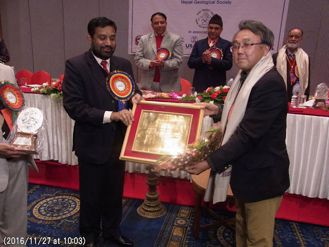 ネパール地質会議の開会式では、酒井治孝さんの長年の貢献をたたえて、名誉会員の表彰式が